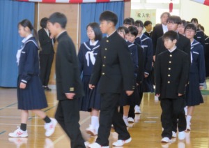 最後に、生徒会役員の任命式・交代式です。校長から、旧役員へは、東中をよくしてくれるために頑張ってくれたことのねぎらいの言葉がありました。新役員へは、やることそのものを目的にするのではなく手段にして、よりよい東中を作り上げていってほしいという激励の言葉がありました。ここまで東中を引っ張ってきた前期役員の皆さん、お疲れ様でした。後期役員の皆さん、これからよろしくお願いします。