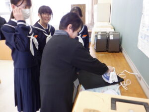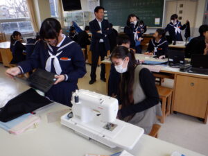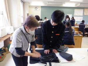 玉結び、玉止め、並ぬい、本返しぬい、まつりぬい、ミシンがけ・・・。なかなかうまくできないことも多いのですが、生徒たちは、講師の皆さんからのアドバイスを聞いて、熱心に作業に取り組んでいました。