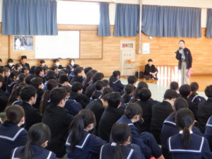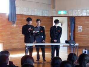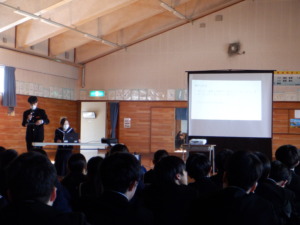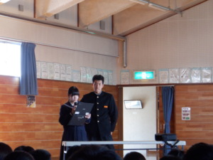 集会では、各クラスがこの1年間の振り返りを発表するとともに、春休みの学習や生活についての話と、学年所属の教員一人一人からの話がありました。