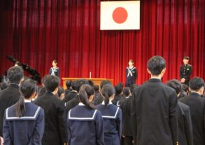 式にあたり、校歌練習を行いました。全校で歌うのは合唱祭以来となります。3年のリーダーが「冬の寒さを吹き飛ばす歌にしていこう」とアドバイスし、全校生徒でしっかりと練習に取り組みました。