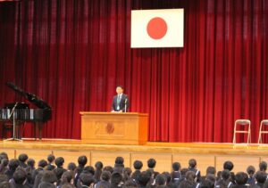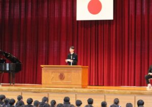 式辞では、校長より、行事に向けて一生懸命に取り組む姿や生徒会役員会を中心に学校をよりよくしようとする姿を見せてくれたことに対するねぎらいの言葉がありました。一方、学校外での約束やマナー、SNSの使い方について、始業式で話した「自分の意志で行動したのだから、そこには責任がついてまわる」ことについてどうであったかを問いかけました。正しい行動をしていること、真面目な行動をしていることに、胸を張って堂々としていってほしい、そして、本気で冬休みを一日一日大切にしてほしいという激励の言葉をいただきました。これらのことを、いま一度振り返ってみてほしいと思います。