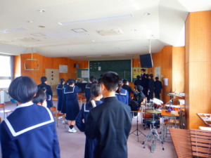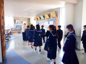 【1学年】学校巡り 2026年4月14日 1学年 4月14日(火)、1年生が校舎内を探検しました。図書館や音楽室など、これからの学習で利用する教室を見学し、どれもはじめて入る教室ばかりで生徒たちは興味津々の様子でした。