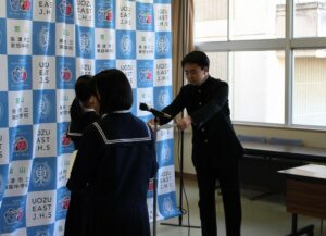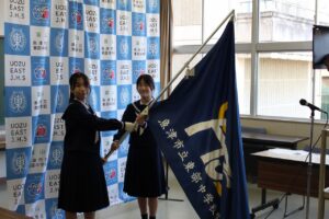 旧生徒会役員から新生徒会役員へのバトンタッチです。引継ぎにあたり、旧会長は「子ども会議等に参加してたくさんの学びを得た。イルミネーション点灯に向けて、積極的にボランティアに参加してくれて嬉しかった。学校づくりに貢献できた喜びを、ぜひみんなにも感じてほしい」と語りました。新会長は、「これまで築いてきたものを引き継ぎ、みんなの声を聴いてさらに充実した生徒会活動を進めていきたい」と意気込みました。そして、旧会長から新会長へ、生徒会旗が引き継がれました。
